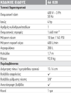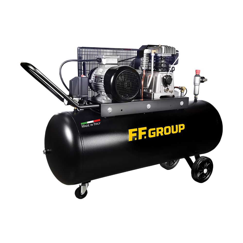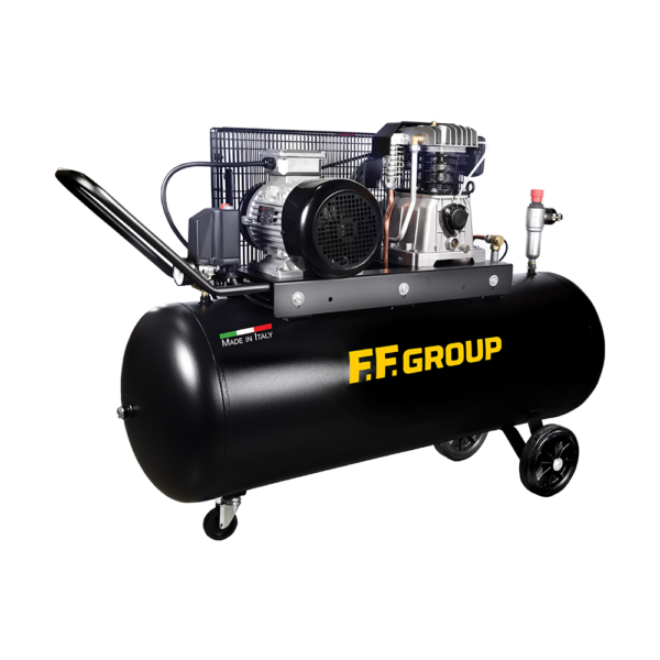 - Ελαιολίπαντος, εμβολφόρος αεροσυμπιεστής με ιμάντα για επαγγελματική χρήση