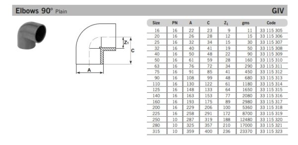 Η Γωνία Κολλητή 90° PVC-U (Elbows 90° Plain GIV) προσφέρει γρήγορη και εύκολη εγκατάσταση, με αξιοπιστία στη λειτουργία και μακροχρόνια απόδοση. Είναι ιδανική για δίκτυα που απαιτούν συχνές αλλαγές κατεύθυνσης με ασφάλεια και αποτελεσματικότητα.