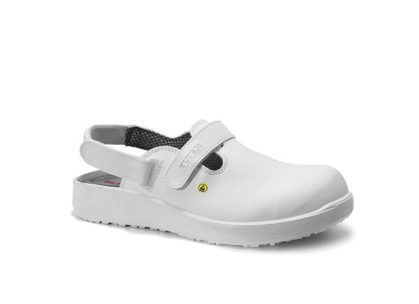 Iδανικό για επαγγελματίες του υγειονομικού τομέα, κουζίνας κ.α. Ένας ιμάντας φτέρνας και ένας σύνδεσμος Velcro στην κεντρική περιοχή του εξασφαλίζουν ιδανική εφαρμογή στο πόδι και κράτημα του παπουτσιού. Με τη βοήθειά τους, το clog μπορεί να ρυθμιστεί σε δευτερόλεπτα και προσαρμόζεται στο πόδι του κάθε χρήστη. Η ανθεκτική στην τριβή σόλα C-FIT από πολυουρεθάνη προσφέρει μέγιστη ασφάλεια σε ολισθηρά δάπεδα, χωρίς επίπονες παρεκκλίσεις του ποδιού. Το White ESD SB MICHEL, κατασκευασμένο από ανθεκτικές μικροΐνες είναι εξοπλισμένο με υφασμάτινη επένδυση που αναπνέει- για επιπλέον φρεσκάδα και υγιεινή. Μεγάλο πλεονέκτημα σας προσφέρει το ατσάλινο καπάκι προστατεύοντας τα δάχτυλα των ποδιών σας από την πτώση αντικειμένων.