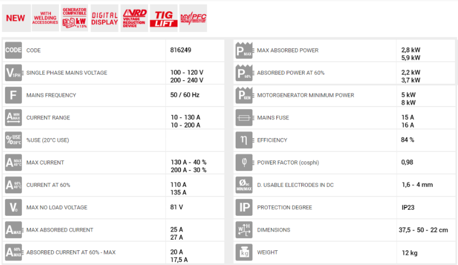 LCD DISPLAY : Σύγχρονη ηλεκτρονική οθόνη για να εγγυηθεί την ορατότητα ακόμη και σε συνθήκες χαμηλού φωτισμού. • Χρήση μεγάλης προέκτασης (250 μέτρα) • MULTIVOLTAGE : Ευέλικτη χρήση με οποιαδήποτε μεταβλητή τάσης σε ένα ευρύ φάσμα (δηλ. 100 / 120V, 180V, 200V, 220 / 240V) • VRD : Για τη βελτίωση της ασφάλειας κατά τις εργασίες συγκόλλησης σε υγρά περιβάλλοντα (ορυχεία, ναυπηγεία κλπ.) • Ενεργειακή : Χαμηλή κατανάλωση ρεύματος. • HOT START IGNITION : Πρόσθετη ηλεκτρική ισχύ για ομαλό ξεκίνημα συγκόλλησης. • ANTI-STICK : Σταματά το ρεύμα συγκόλλησης εάν το ηλεκτρόδιο κολλήσει στο υλικό. • ARC- FORCE : Αυτόματο καλυμπράρισμα ρεύματος κατά την διάρκεια της κόλλησης για τέλειο γαζί. • TIG – LIFT : Για μέγιστη ποιότητα συγκόλλησης TIG. • Συμπαγής και ελαφριά. • Θερμοστατική • Προστασία υπέρτασης-υπότασης , προστασία υπερέντασης. • Προστασία γεννήτριας (± 15%) • Πλήρης με αξεσουάρ συγκόλλησης TIG.