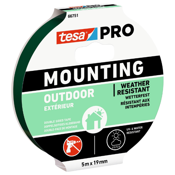 Η tesa PRO Mounting Outdoor κάνει τις εργασίες εφαρμογής σε εξωτερικούς χώρους για τους επαγγελματίες τεχνίτες πιο γρήγορες και εύκολες. Η ταινία κολλά σε ιδιαίτερα περίπλοκες επιφάνειες όπως πλακάκια, τούβλα, μέταλλα και σκληρά πλαστικά χάρη στην ισχυρή και αξιόπιστη συγκολλητική της δύναμη. Επιτύχετε μακροχρόνιες συγκολλήσεις και ασφαλίστε βασικά αντικείμενα εξωτερικού χώρου για τους πελάτες σας, όπως γραμματοκιβώτια ή αριθμούς σπιτιών, με αυτή την ταινία που είναι ανθεκτική στην υπεριώδη ακτινοβολία, το νερό και τη θερμοκρασία.
