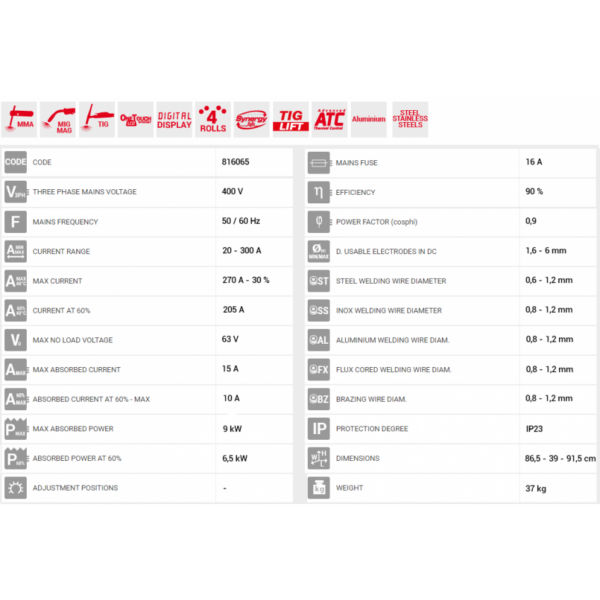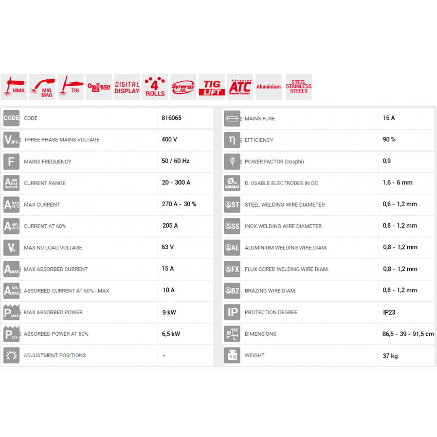 - Η ρύθμιση SYNERGIC των παραμέτρων συγκόλλησης χάρη στην τεχνολογία “ONE TOUCH”, καθιστά τη μηχανή πολύ εύκολη στην χρήση.