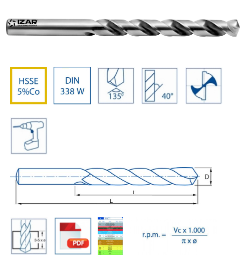 Το Τρυπάνι Σιδήρου ΙΝΟΧ (DRILL BIT HSSE DIN338W STAINLESS) της IZAR είναι σχεδιασμένο για επαγγελματική διάτρηση σκληρών υλικών, όπως ανοξείδωτος χάλυβας και κράματα μετάλλων υψηλής σκληρότητας.